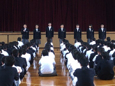 旧生徒会役員は退任の挨拶、新生徒会役員は所信表明を、