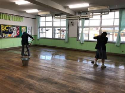 美化委員が教室の床の隅々まで油を行き渡らせています。