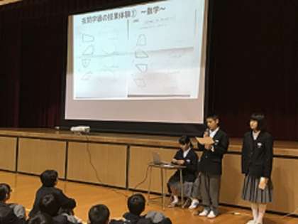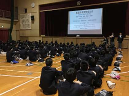 本日の1年生学年集会で、生徒会執行委員が11月に行かせていただいた夜間学級交流会の報告をパワーポイントを使用し発表しました。