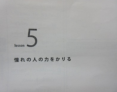 lesson5は「憧れの人の力をかりる」です。「学ぶ」という言葉の語源は「真似ぶ」です。憧れの人は、きっと自信満々でカッコイイと思う瞬間があるから憧れるわけで、形から入ってみるのも良いのではないでしょうか。理想的な表情やしぐさは、自分だけでなく周りの人の心にも影響を与えるからです。