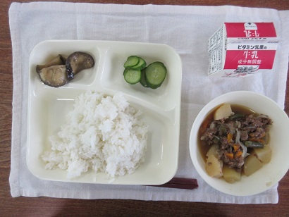 「今日の給食は、ごはんと肉じゃがの相性が良く、とてもおいしかったです。また、きゅうりがあることで後味さっぱりと食べられました。」