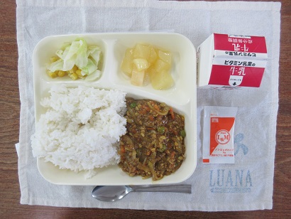 「キーマカレーとごはんがとても合っていて、サラダもドレッシングと合わさりさっぱりとしていておいしかったです。また、白桃は甘くてピッタリのフルーツでした。」