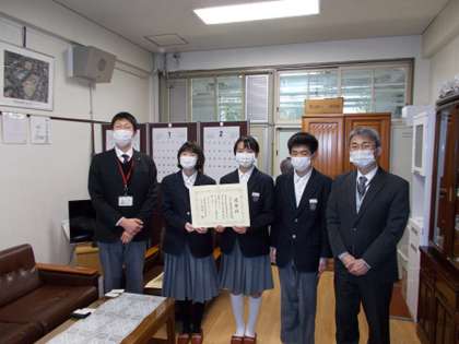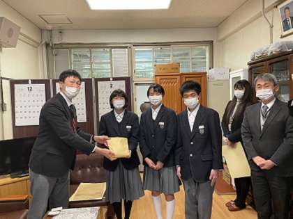 本日、日本赤十字社の方々が此花中学校に来てくださいました。今回集めた寄付金を生徒会役員メンバーから直接手渡すことができました。少し緊張した様子でしたが、地域の方々や生徒たちが協力して集めたこと、今逼迫している医療現場へ少しでも助けになればという思いをしっかりと伝えることができました。