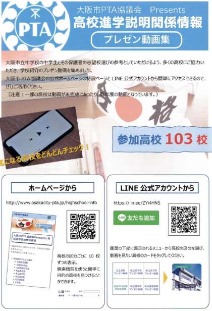 大阪市PTA協議会Presents 高校進学説明会関係情報として、高等学校から提供されたプレゼン動画を集め、一元化された学校紹介プレゼン動画が配信中です。