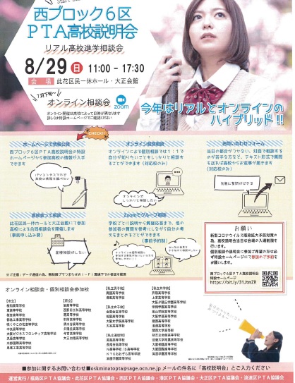 8月29日に西ブロック6区PTA高校説明会合同リアル相談会を開催する予定としていましたが、ここ数日の新型コロナウイルスの感染状況等を鑑みて、リアル相談会の開催を中止することになりました。