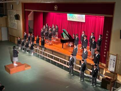 当日、少し緊張している姿がみえました。しかし、歌い始めると、各パートの声のバランスがよく、一人ひとりが一生懸命に歌ってる姿が見えました。いつだってみんなで協力してきた2年1組。今までみんなで困難を乗り越えてきたからこそ仲間を信じて一人ひとりがしっかりと声をだすことができました。