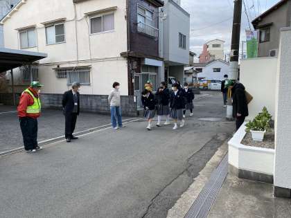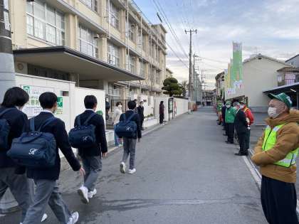 先日(15日)のことになりますが、寒空の中、此花区青少年指導委員の方々が、本校生徒の登校に合わせて「あいさつ運動」をしてくださいました。「おはようございます」の声が響き合う気持ちの良い朝となりました。