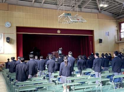 本日、3年生は卒業式の練習を行いました。入場・退場や証書授与、合唱など4時間かけて練習しました。59期生が、3年間で成長した姿を11日に卒業式にみせてくれることを期待しています。その後、明日の一般選抜入試に向けての事前指導を受けました。受験への不安、友達との別れが近づく名残惜しさ、さまざまな感情が入り混じる1日でした。