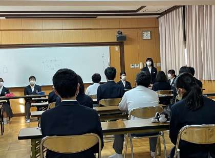 本日、今年度初めての生徒議会を行いました。議題は「自己紹介」でした。一人ひとりが新しい学年になり、それぞれの思いや目標を発表してくれました。1年生は、初めてのことばかりで不安でいっぱいだと思いますが、先輩の背中を追いかけてください。たとえ失敗したとしてもみんなが助けてくれます。2年生は半年後、中心になっていく人たちです。それを意識し、この半年でたくさん学んでください。そして3年生。みんなが中心で活動していくのも残り半年です。後輩に良い行動を残せるようにかっこいい姿をたくさん見せてください。各学年、個人が1つ1つの課題を乗り越えていくことで良い学校になっていきます。この半年、このメンバーで頑張っていきましょう!
