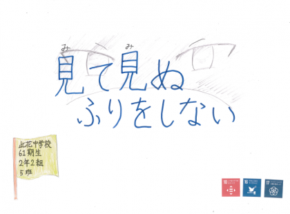 61期生は「いじめについて考える日」をきっかけに、先週1週間で「いじめ」をなくすためには何ができるのかを考えてポスターを制作しました。そのポスターを今日61期生の代表4名で伝法小学校に持っていき、児童会の6年生に渡しました。この「いじめ防止啓発ポスター」は伝法小学校の教室と正門に掲示してくださるそうです。