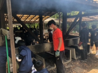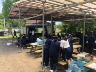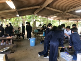 9時から始めた野外炊飯。係の人たちがそれぞれの役割をしっかり果たして、班で力を合わせて作りました。ご飯とルーの出来は班それぞれですが、充実感と共に、いつものカレーとはまた違った美味しさを感じていることでしょう。。。