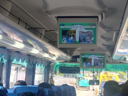 各クラス、バスの中で熊本県益城町に起きた震災についてDVDを見て学習しています。