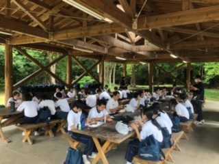 バス酔いが心配されていた生徒も元気に昼食を取っています。この後は、学年オリエンテーリングです。班で協力して、みんなで楽しみながら学びましょう。