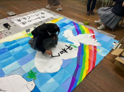 文化発表会の取り組みで行っていた拡大模写が完成しました。生徒が1枚ずつ絵を描き、それを貼り合わせることで1枚の大きな絵が出来上がりました。最後に平和に対してのメッセージを書き上げました。