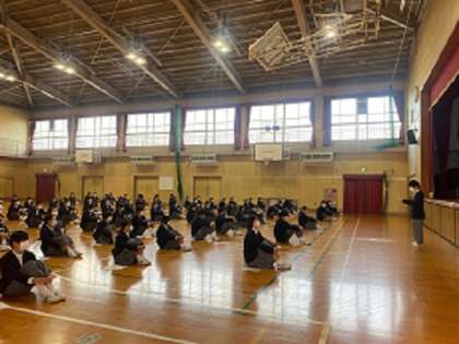 「最近は、ほとんど2分前着席はできるようになってきたと思います。ですが、着席した後、喋ってしまうという点について各クラス課題として残っています。そのため、2分前の在り方を改めて考えてもう一度徹底するようにしましょう。先週から課題解決学習が始まりました。内容としては難しいですが、全員で協力し合って進めていきましょう。そして最後には、今回お世話になった企業の方々に、良いものを見せれるように頑張っていきましょう。」