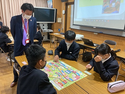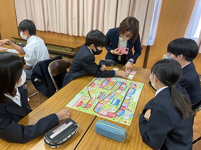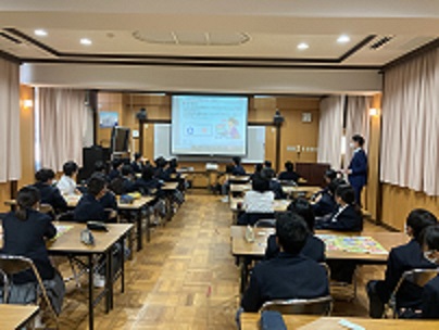 本日、1年生はキャリア学習を行いました。第一生命株式会社より講師をお招きして「ライフ×マネーラーニング」という授業を行っていただきました。初めに、成人年齢の引き下げにより、これまでより早い段階から生涯にわたるお金の勉強をしていく必要があるとお話していただき、生徒たちも真剣に取り組むことができました。前半は「ライフサイクルゲーム」というすごろく形式のゲームを使い、生涯で必要なお金や万が一の備えを楽しみながら学習できました。後半は、消費者被害にあわないようにするためのお話、自転車事故を起こしてしまったときの損害賠償のお話をしていただき、生徒たちにとってこれからの生活に役に立つ勉強になりました。