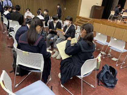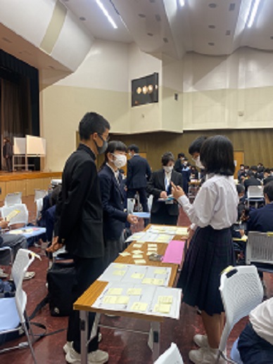 西成区民センターの区民ホールで大阪市スマホサミットが行われました。夏休み明けに各ブロックで「スマホとかしこくつきあうためのルール」を出し合い、スローガンを考えました。各校で話し合い、代表校を決めました。惜しくも、代表校には選ばれませんでしたが、この大阪市スマホサミットで代表校の発表を聞き、参加校の生徒会執行部と一緒に「自校の生徒みんながほんまにスマホとかしこくつきあうためのルールを考えましょう」をテーマに意見交換を行いました。他校の生徒との意見交換でも積極的に意見を言い、話し合いをしていました。