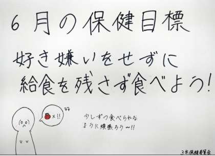 6月の保健目標は「好き嫌いをせずに給食を残さず食べよう」です。