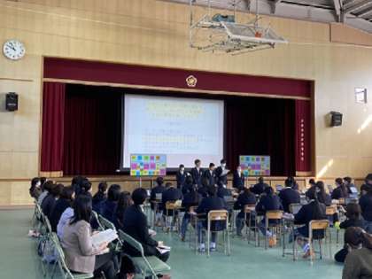 本日、3年2組の生徒は、体育館で家庭科の研究授業に参加しました。近畿地区の家庭科の先生が大勢見守るなか、生徒たちは保育実習での取り組みを大きな声で発表したり、グループワークをしたり、3年生らしく立派に授業に取り組んでくれました。