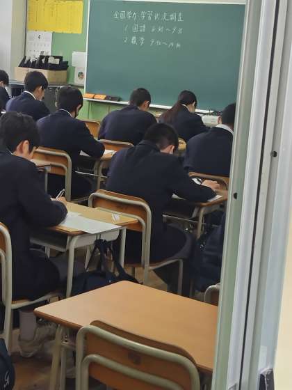 本日の1限・2限に3年生を対象に全国学力・学習状況調査を実施します。この調査の目的は義務教育における各学校段階の最終学年における学力到達度を把握するため、小学校6年生と中学校3年生を対象に実施することにより、全国的な義務教育の機会均等とその水準の維持向上の観点から児童生徒の学力、学習状況を把握、分析することにより、今後の教育に資するものです。実施内容としては「学力調査」として国語・数学のテストを実施し、「質問紙調査」として生活習慣・学習環境等に関する質問に回答してもらいます。