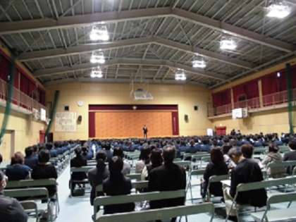 全校生徒約480人が集まる体育館に7人の美しい歌声が響き渡り、