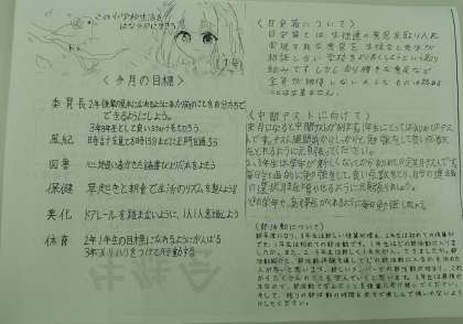 中学校の生徒会活動は、生徒が自発的、自治的活動を行う機会です。また異なる学年との交流を深める場でもあります。学校の全生徒を組織する生徒会で、生徒は一人ひとりの役割に活動意欲を持ち、創意工夫しながら社会生活の基盤を培ってほしいですね。会長以下役員のみなさん、1年間お世話になります。