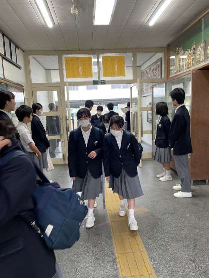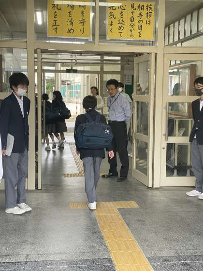 正門で校長先生をはじめ、各学年の先生方に迎えられて『おはようございます』と大きな声で挨拶をして登校してくる生徒達です。