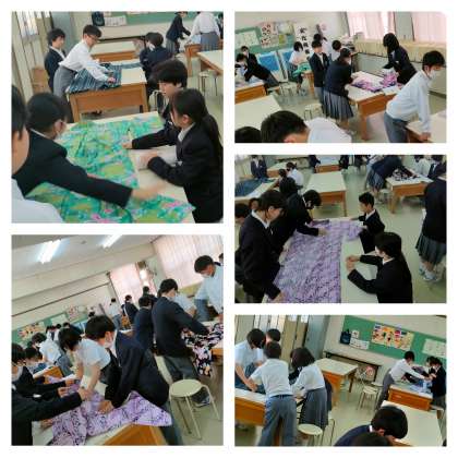 日本の衣文化の学習で浴衣を取り扱いました。班ごとに部位を確認したり、教科書を見て浴衣を畳んだりしました。初めて浴衣にふれる生徒もおり、洋服とは違う形に戸惑いながらも最後はきれいに畳むことができていました。