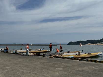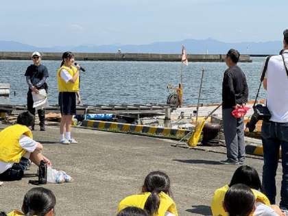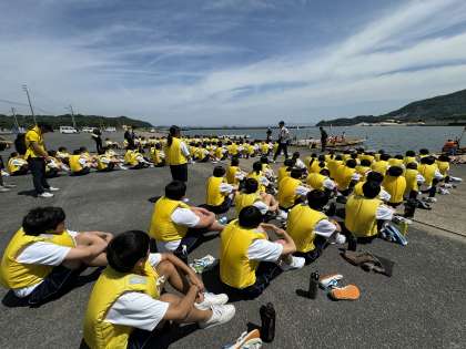 活動の前に操舵方法や安全面についてレクチャーを受け、ライフジャケットを着用して本番に向けて準備をしています。