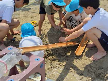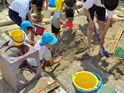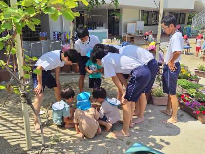 ふれあいダンスで少し仲良くなりました。さあ、園庭で泥んこ遊びと花のジュース作りを一緒に遊ぼうね。