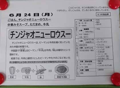 今日の給食はチンジャオロースにニューがはいってますね。二つの違いは漢字で表記するとわかりやすいです。チンジャオロースは青淑肉絲、チンジャオニューロースは青淑牛肉絲と書きます。つまり材料のお肉が豚肉か牛肉の違いだそうです。