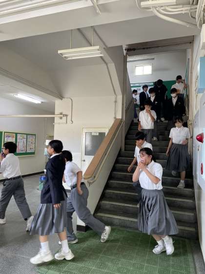 避難訓練の実施パート2 公開日 2024/06/26 更新日 2024/06/26 学校行事 期末テストの最終日、4時限目に避難訓練を実施しました。 生徒が火災発生時に安全に避難できる能力を養うことを目的として行われました。 お:おさない は:はしらない し:しゃべらない も:もどらない を守り緊迫感の中、運動場まで移動しました。 いいね(0)