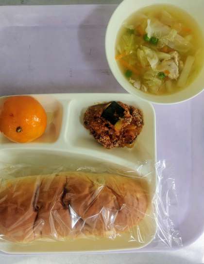かぼちゃのミートグラタン 鶏肉と野菜のスープ みかん(冷)