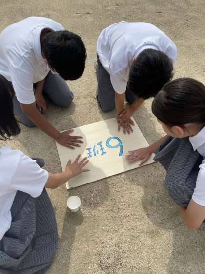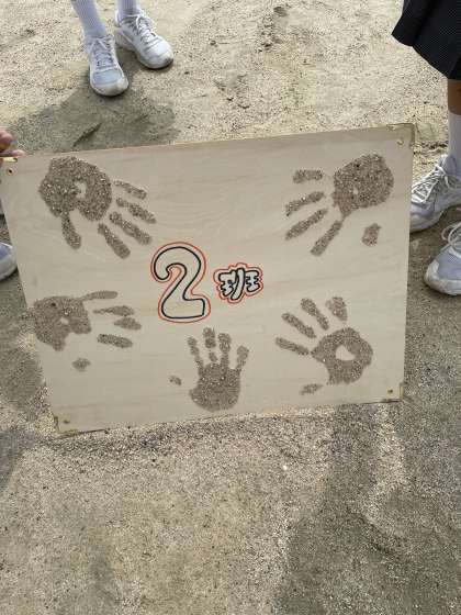 昨日までの雨で運動場の砂が心配でしたが、朝から梅雨の晴れ間に恵まれ美しく砂絵アートが出来上がりました。