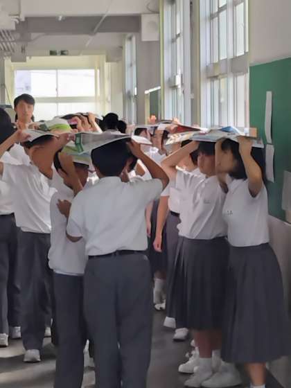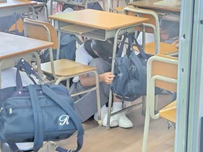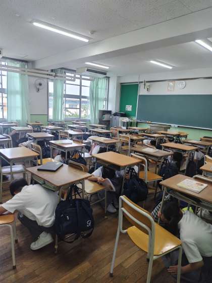直ちに机の下に潜り込み、落下物から避難しました。その後、地震が一時的に治まった間に教科書を頭に乗せグラウンドに向かいます。
