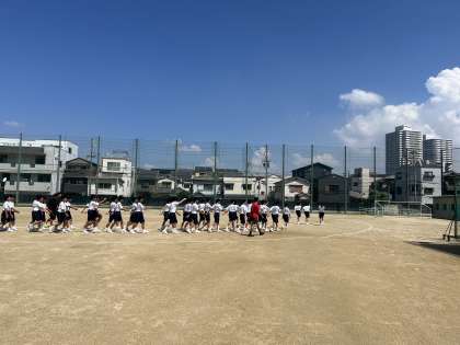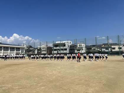 音楽・笛の合図にを聞きながら体育科の先生に加えて学年の先生もサポートしながら、みんなで力を合わせて入場行進の練習です。