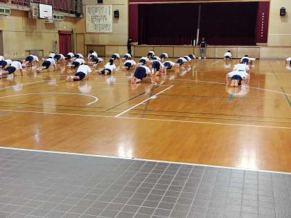 各学年ともラジオ体操から行進へと続く基本の練習を整然と力強い動きとなるようにしっかり練習しています。