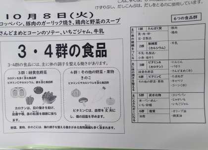 本日のメニューは、3・4群の野菜たっぷりの食品が中心であることがわかります。