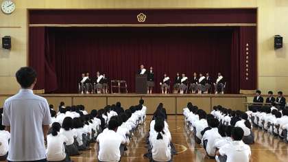 本日の6限に令和6年度〜令和7年度の生徒会役員選挙、立会演説会が実施されました。まず、現生徒会長から、引き続き選挙管理委員長からそれぞれあいさつの後、会長候補から順に立候補者の演説と応援者による演説を受けました。そののち、教室に戻り投票、開票となります。今回は全員信任投票となります。