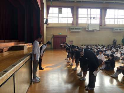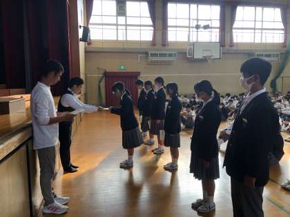 生徒会新役員の認証式 公開日 2024/10/22 更新日 2024/10/22 委員会活動 本日、生徒会役員認証式を実施しました。 教頭先生から現生徒会役員へのねぎらいの言葉に続き、新生徒会長をはじめ新役員に認証状が渡されました。その後、新旧両生徒会長より退任と就任のあいさつをいただき認証式を終えました。 いいね(0)