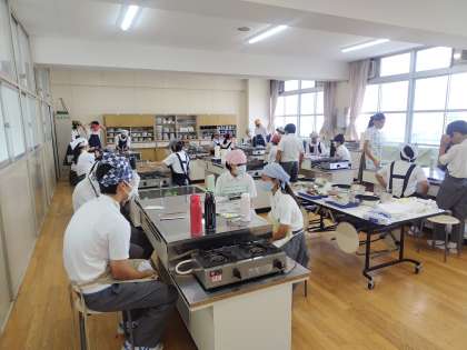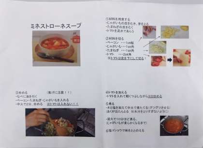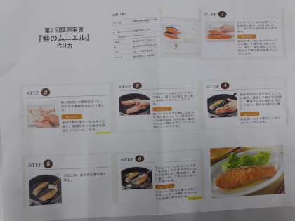 今日のメニューは「鮭のムニエル」とミネストローネスープです。1限の間に作りそして試食も行います。事前に授業で段取りは学んでいましたので皆さん時間内に出来上がりました。