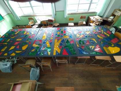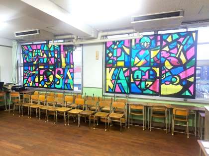 2年学年制作のセロファンによるステンドグラス風の作品です。上段には大阪の風物詩、下段はOSAKAの文字を表しています。素晴らしい作品に仕上がっています。どうぞご覧ください。
