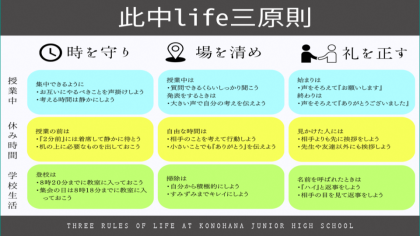 具体的な行動として、今年度作成した此花中学校のマトリクス(行動目標)である『此中 life 三原則』の中から1週間に一つを選択し、特に重点的に取り組む内容として生徒会を中心に活動を行っていきます。