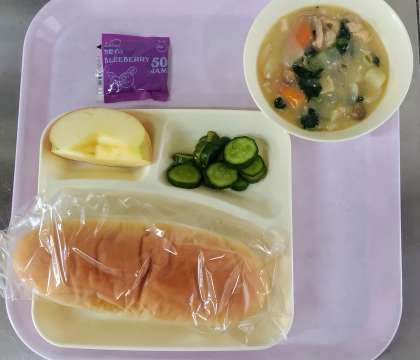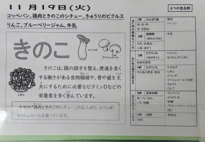 今日の給食は鶏肉ときのこの具だくさん♪3種のきのこのうま味が二重丸♪体もしっかり温まるシチューです。