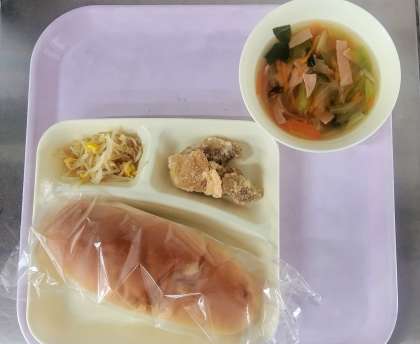 もやしとコーンの中華あえ ぶどうぱん 牛乳 です
