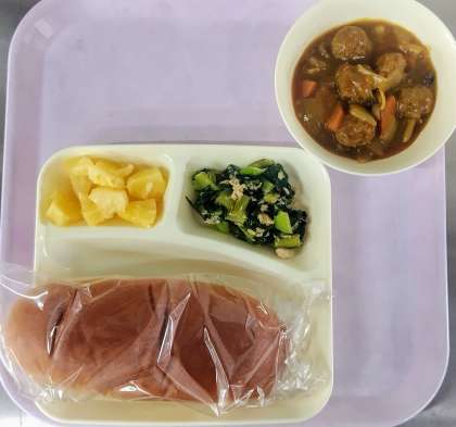 ミートボールと野菜のカレー煮  ツナと小松菜のソテー