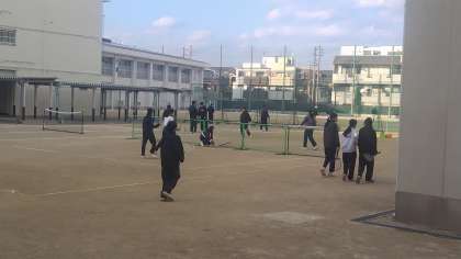 ただいまの気温6度、風速6m、とても寒いグラウンドで頑張る部員の皆さん。屋外ではソフトテニス部、軟式野球部、陸上部の皆さんが元気よく活動をしています。