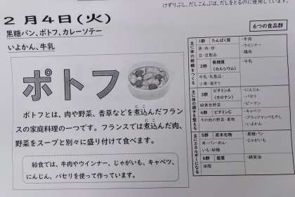 今日は温かいポトフで冷えた身体を温めましょう。しばらく寒さが厳しく、風も強くなるそうです。シッカリ手洗い、うがいをして夜も温かくして休みましょう。