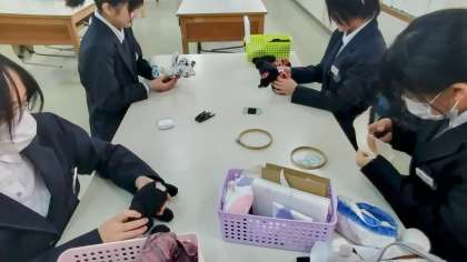 家庭科部では現在古着リメイクとして、自宅にある古着を切ったりつなげたりして、新しい形に作り直す部活動を行っています。まだ、途中ですが作成風景を見せてもらいました。作品は「古着リメイクのくまちゃん」です。可愛くできていますね。