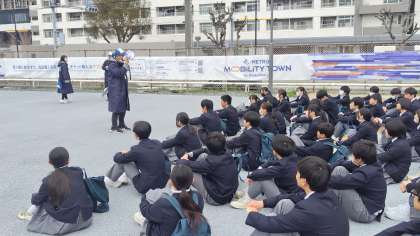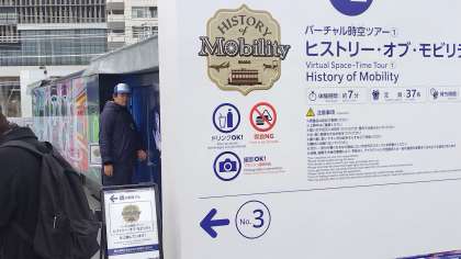 画像Mobility town コースから大阪城コースの班をご紹介します。Mobility townとは未来モビリティ体験型パークで、過去から未来へと変遷する交通機関の姿をご紹介する施設です。まずは入り口で説明を受け、施設内を順次体験したり見学をしました。